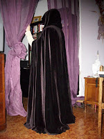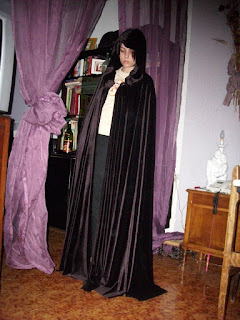 La capa es en terciopelo negro, una capa de círculo completo (la numero 5 en la galeria), con una bonita capucha, forrada por dentro en terciopelo tambien.