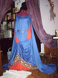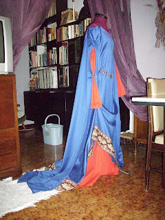 Las mangas, se hicieron completamente abiertas y largas hasta el suelo, con un broche dorado a medio brazo para abrirlas o cerrarlas, segun el momento. Quedan preciosas ya que debajo aparece la otra manga roja estrecha, muy muy elegante a mi parecer.