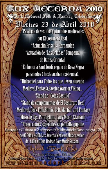 Lux Aeterna es una fiesta medieval celebrada en el Undead Dark Club durante la noche del viernes 23 de Abril, con motivo de la festividad de San Jordi.Con actuaciones en directo como la de Priscilla Hernandez, y muchas otras actividades, tengo el placer de anunciaros que el Costurero Real realizara una pasarela con trajes medievales, renacentistas y faericos.